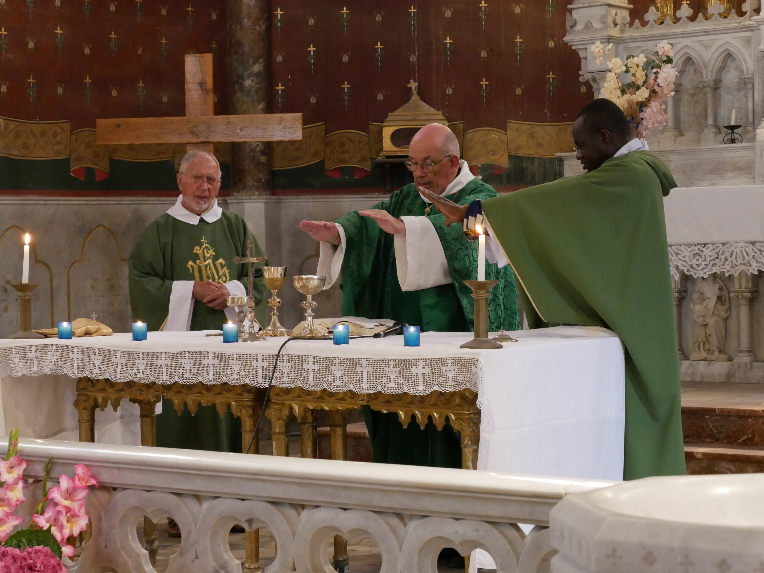 On arrive à la fin de la cérémonie; Avant l’Envoi, Jean Louis Terrat lit les annonces pour la semaine. Puis Monseigneur prononce la bénédiction finale