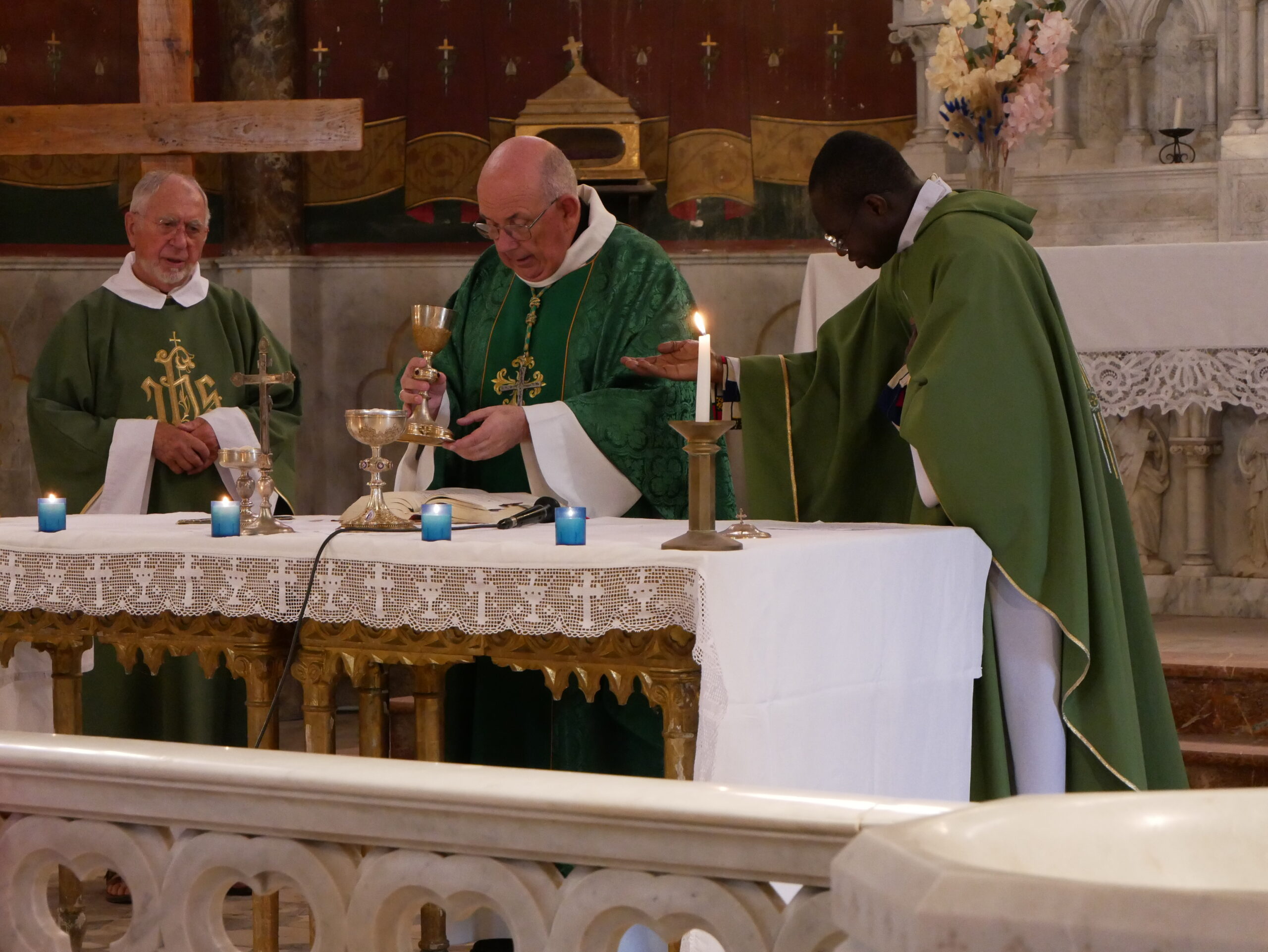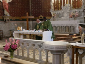Un petit signe du Père Herman, la Chorale entonne le chant d’entrée « Peuple de Dieu, cité de l’Emmanuel ». Les célébrants s’avancent vers l’autel.