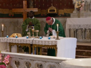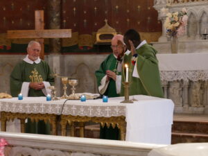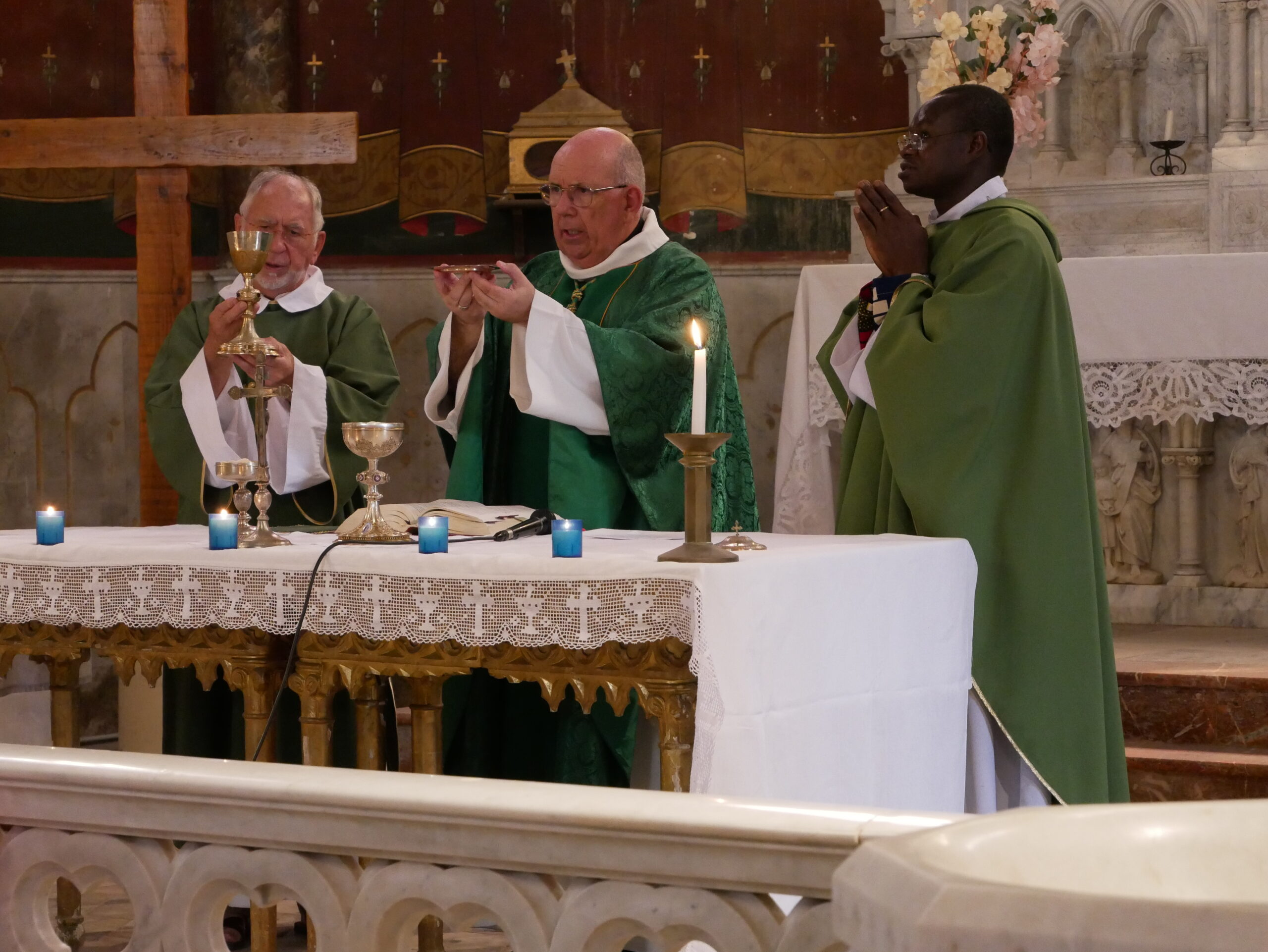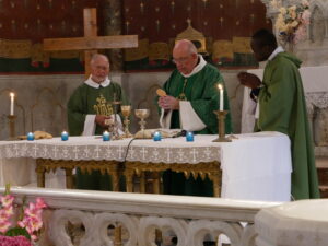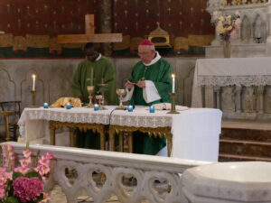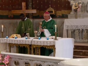 Après ce moment fort de notre vie de chrétien, nous réciterons tous ensemble le Notre-Père puis c’est le moment de la communion, distribuée par Monseigneur et le diacre Daniel. Pendant la communion la Chorale et l’assistance chante Voici le pain que nous donne Dieu